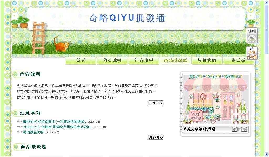 線上聯絡我們 購物車 訂單查詢 | 填寫需求表單,線上寄出至店家的Email裡 購物車系統購買結帳,後台訂單查詢 結帳設定方式:ATM/匯款/貨到付款 |